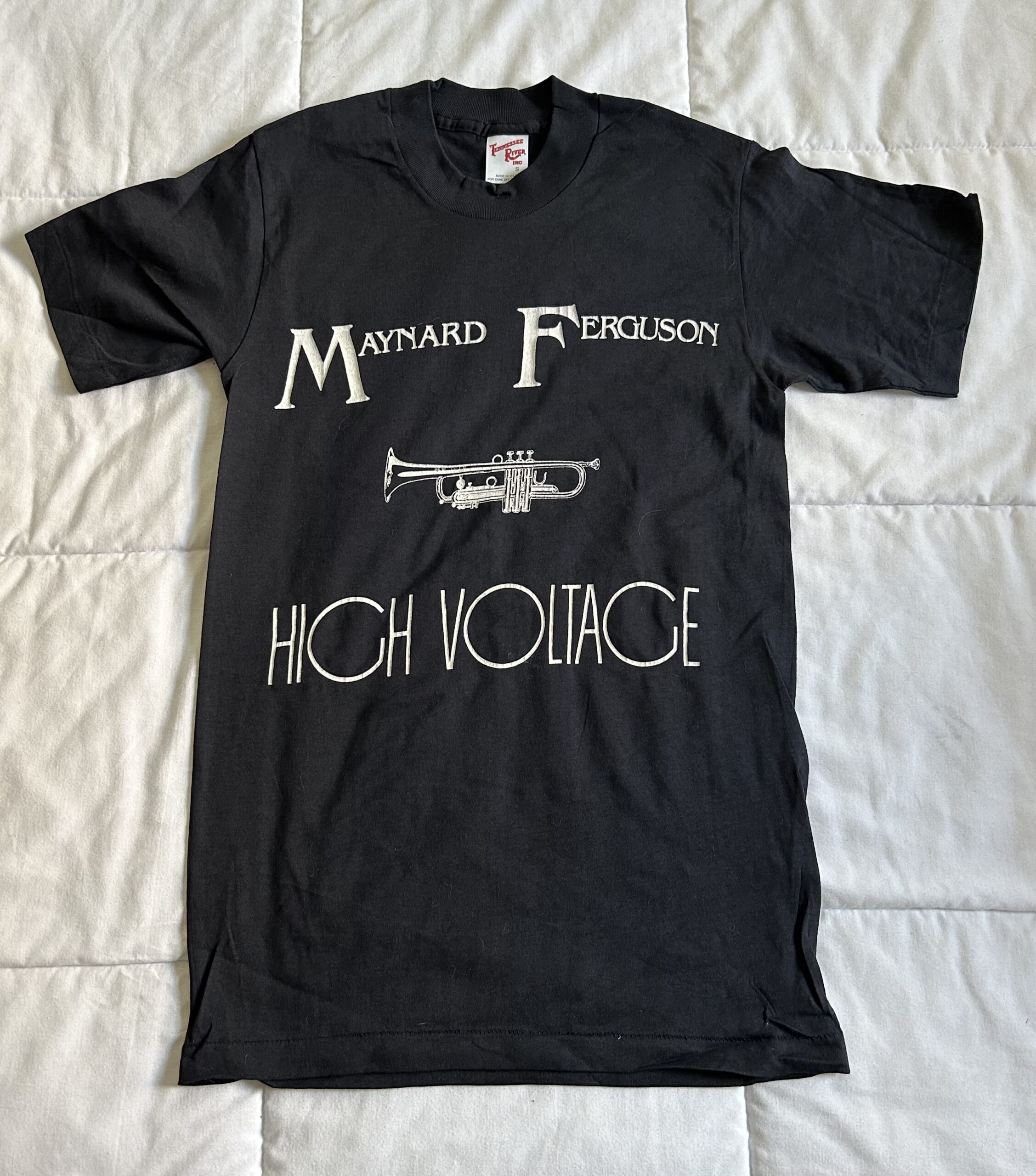 Black tee with “High Voltage” and a trumpet.